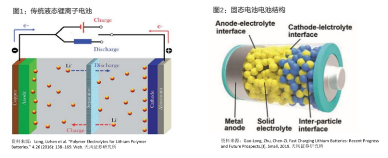 傳統(tǒng)鋰電池構(gòu)成包括正極、負(fù)極、電解液、隔膜四大材料。而固態(tài)電池則將電解液和隔膜換成了固態(tài)電解質(zhì),其余類似。