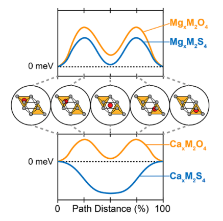 圖28 在氧化物(橙色)和硫化物(藍色)尖晶石中觀察到的Mg(頂部)和Ca(底部)遷移勢壘的定性表征