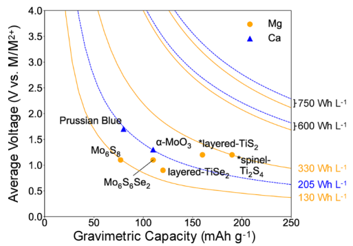 鎂電解液的改進急需開發(fā)更高電壓的陰極。圖26中顯示了多價離子陰極的比容量與電池能量密度曲線。