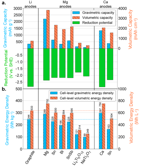 圖25 (a)Mg和Ca陽極的理論重量/體積容量和還原電位。(b)估算的電池級重量/體積能量密度