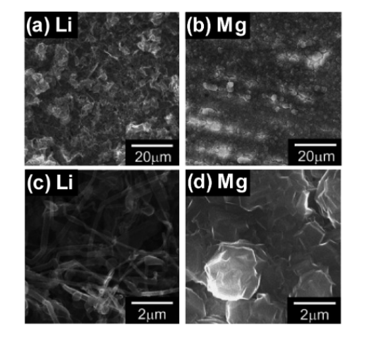 對Li和Mg沉積的表面形貌進行了比較(圖24)。與觀察到的Li枝晶生長不同,Mg的沉積比較均勻,無枝晶形成。但鎂和鈣體系中采用金屬陽極時,如何獲得光滑金屬鍍層仍然是技術瓶頸,因電解質分解易在金屬表面形成離子絕緣層。