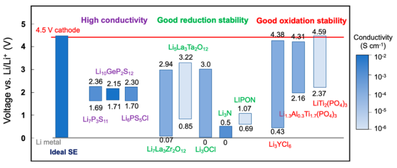 SEs的穩(wěn)定性對于評估ASSB的長循環(huán)壽命至關重要。圖18顯示了不同電解質的氧化和還原極限。顯然,SE的穩(wěn)定性在很大程度上取決于材料的化學性質。目前還沒有兼具高氧化極限和低還原極限的SE。