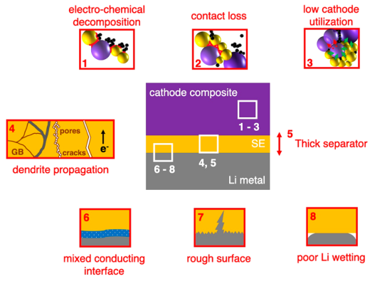 ASSB面臨的主要問題如圖17所示:當充電至高壓或在高溫下共燒結時,SE可能會分解或與陰極材料反應;循環(huán)時陰極材料的體積變化會導致陰極和SE接觸不良;鋰金屬沉積/溶解過程中的接觸損耗;可能的界面反應以及鋰枝晶在SE中的滲透等。這些機械和化學界面不穩(wěn)定性會增加過電勢,導致較低的能量密度和容量衰減。實際電池要求陰極載量高,SE厚度薄,易于加工和處理。