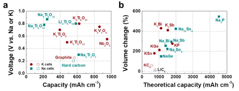 圖12 (a)NIB和KIB的嵌入型陽極的容量-電壓圖;(b)合金陽極的理論容量與體積變化的關系