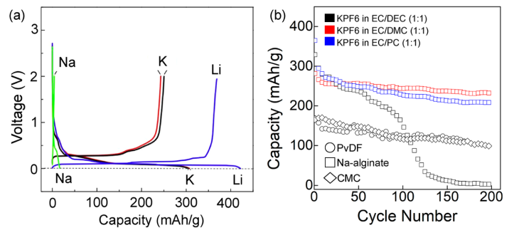 圖10 (a)采用聚丙烯酸酯粘結劑的石墨電極的充放電曲線。(b) KIB中粘結劑和電解質對石墨陽極容量的影響