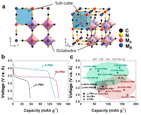 PBA是一類具有六方鈣鈦礦型,面心立方結構(空間群Fm3?m)的金屬鐵氰化物,如圖8a所示,其化學組成為AxMA[MB(CN)6]y(A=Li,Na,K等,M=過渡金屬(Fe,Mn,Co,Ni,Cu等),0<x<2))。圖8b為AxMn[Fe(CN)6](A=Li, Na, K)的放電曲線。隨插層離子尺寸的增大,電壓也隨之增大。圖8c所示 PBA中K+嵌入的高電壓可能是由于K+與金屬有機骨架之間的相互作用更強,穩(wěn)定了放電產物。