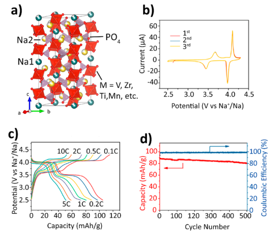 圖7 a)典型的NASICON型晶體結構。Na3MnZr(PO4)3 的(b)循環(huán)伏安曲線,(c)倍率性能,(d)循環(huán)性能