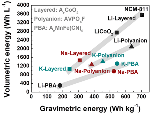 圖5比較了層狀氧化物(如AxCoO2)、聚陰離子化合物(如AVPO4F)和PBAs(如A-MnFe (CN)6)(A=Li,Na,K)的重量和體積能量密度,可見堿離子尺寸的不同影響導致在Na/K體系中,聚陰離子化合物/PBA的體積能密度與層狀化合物相當,具有與層狀氧化物競爭的潛力。