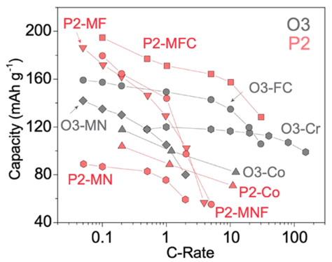 分子式為NaxMO2(KxMO2),通過共邊的MO6八面體形成重復的層結構,Na+/K+位于層間。通過堿離子周圍的配位幾何結構(O,八面體;P,棱形)及最少重復單元(O-M-O和O-堿金屬-O)的堆垛層數(shù)來標記。如P2表示具有棱形配位和ABBA型氧堆積。O3表示具有八面體配位和ABCABC氧堆積。圖3總結了各種P2-Na和O3-Na層狀氧化物陰極的倍率性能。在比較不同材料的倍率能力時,需考慮電池組裝,電極制備,粒徑和形態(tài)以及導電添加劑的影響。