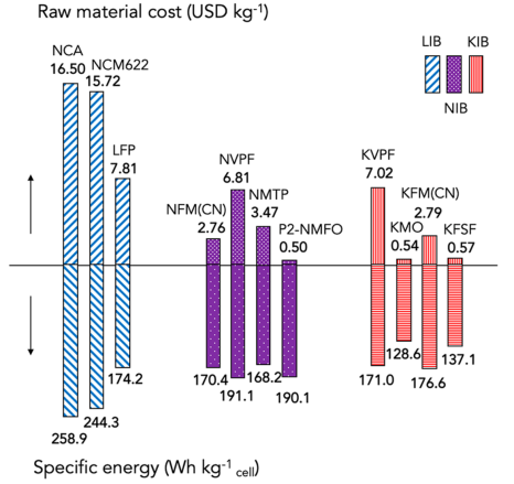 NIB/KIB是“下一代電池”技術的代表性示例,二者有望解決LIB所面臨的資源問題,在NIB或KIB的陰極材料中使用價廉的氧化還原物質(如Mn和Fe)替代Co和 Ni有望降低電池的總成本,使其在對重量和體積能量密度要求不太高的領域作為具有成本優(yōu)勢的替代方案。圖1比較了LIBs、NIBs和KIBs陰極材料的原材料成本以及使用這些材料構建的全電池的質量能量密度。