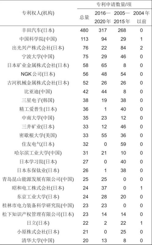 表3 全固態(tài)鋰電池技術(shù)專利權(quán)人(機(jī)構(gòu))及其專利申請(qǐng)時(shí)間分布情況