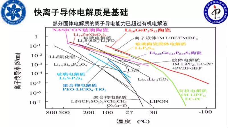 全固態(tài)電池能夠走到今天熱起來,是因為大家看到了希望,就是說固態(tài)電解質(zhì)有了長足的進步。今天一部分固體電解質(zhì),它的離子導(dǎo)電能力已經(jīng)遠超今天的有機溶劑電解液,這是幾十年來發(fā)展的很大的進步,我1988年到物理所跟陳老師做固態(tài)電池。那個時候沒有這么好的電解質(zhì),那時候美國也在做硫化物,后來楊原老師把這個東西帶到物理所,也在物理所整硫化物,但是那個時候的離子電導(dǎo)率沒有今天這么高。今天電解質(zhì)的電導(dǎo)率高到這個程度,特別是低溫情況下比有機電解液好很多,那有沒有可能做出寬溫區(qū)工作和功率性能更高的固態(tài)電池?