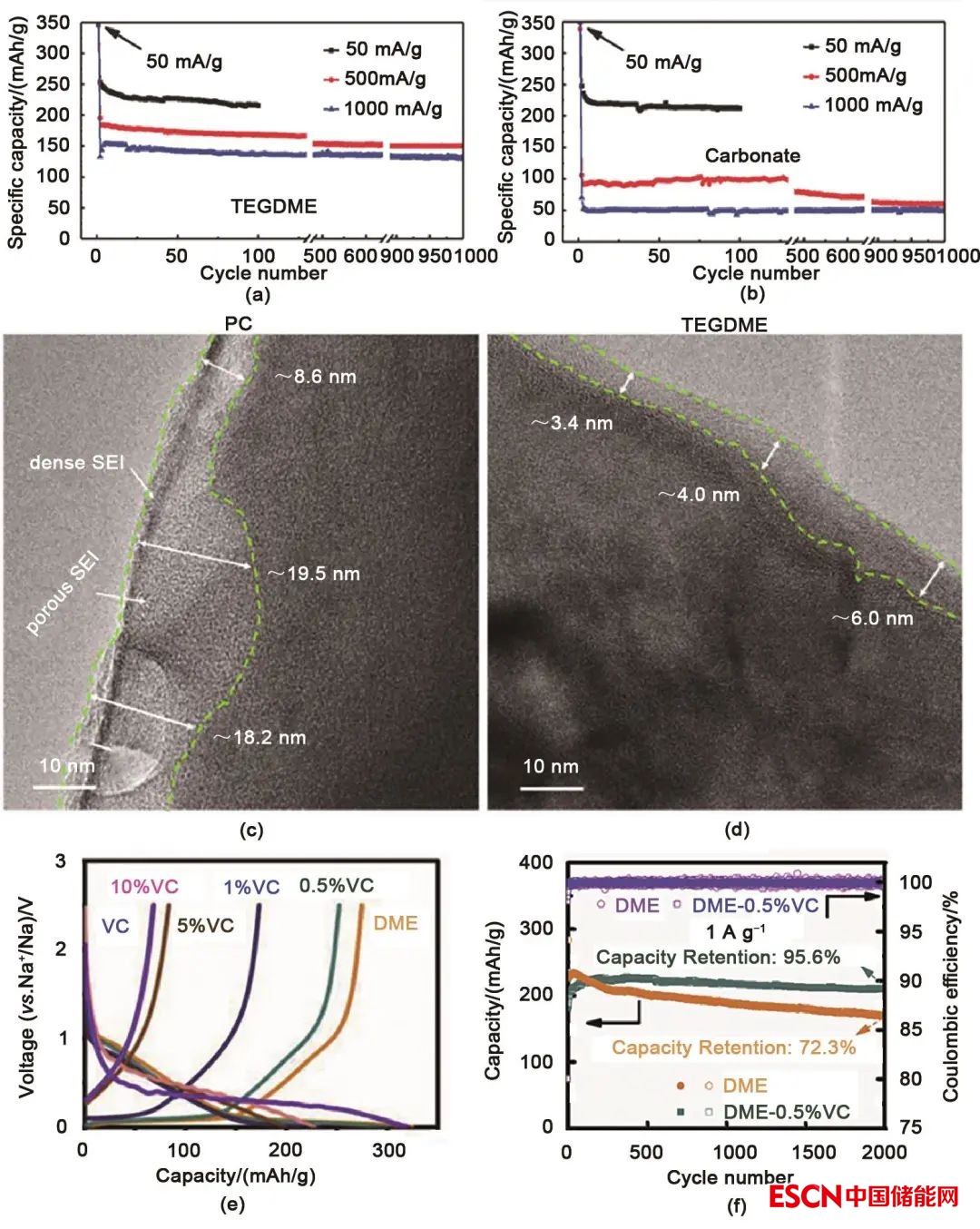 針對硬碳材料本身的改性得到大量研究,但硬碳材料所面臨的首次庫侖效率和倍率性能問題無法同時得到改善。而電解液的分解是硬碳首次庫侖效率低的主要原因,因此,優(yōu)化電解液是提高首次庫侖效率的有效方法。醚類電解液因其與碳基材料有良好的相容性而得到廣泛研究。理想的SEI膜應是較薄且穩(wěn)定,即初始循環(huán)消耗的電解質(zhì)和堿離子較少,一旦SEI膜形成,它將作為鈍化層,在連續(xù)的循環(huán)中防止電解質(zhì)和堿離子的進一步消耗。醚類電解液相比于酯類電解質(zhì)在負極表面能生成更薄更穩(wěn)定的SEI膜。Seh等首次報道了一種簡單的醚基電解質(zhì)六氟磷酸鈉,在沒有任何添加劑和對陰極材料進行表面涂層情況下,300次循環(huán)中實現(xiàn)99.9%的高平均庫侖效率,歸因于醚類電解質(zhì)在陰極上誘導形成均勻SEI膜。Xiao等研究顯示四甘醇二甲醚(TEGDME)和碳酸鹽電解質(zhì)中的硬碳在低電流密度(50 mA/g)容量及容量保持率相差不大,但硬碳在1000 mA/g電流密度下測試時,在TEGDME中的比容量約為150 mAh/g,是碳酸鹽中值(50 mAh/g)的3倍,進行1000次循環(huán)容量保持率約為85%,而在碳酸鹽中為70.2%[圖7(a)、(b)],歸因于硬碳在TEGDME電解液中形成更薄且更穩(wěn)定的SEI膜。同樣,Hirsh等[41]在探討硬碳在常規(guī)碳酸鹽電解質(zhì)和高性能醚基電解質(zhì)中的性能和機制差異中表明,在醚基電解質(zhì)中可實現(xiàn)更高的首次庫侖效率、更高的倍率性能和優(yōu)異的循環(huán)性能。同時,通過低溫透射電鏡、SEM、EDS和XPS以三種不同的速率探索了SEI的形成,結(jié)果顯示,在醚基電解液中生成更薄、更穩(wěn)定、更均勻的SEI膜[圖7(c)、(d)],使硬碳在不同電流密度下具有優(yōu)異的電化學性能。Dong等使用制備的硬碳納米球報道了醚基電解質(zhì)中獨特的溶劑化鈉和鈉共嵌入機制,這種獨特的機制避免了緩慢的去溶劑化過程,從而增強了鈉的儲存動力學。此外,通過低溫透射電鏡和深度剖析X射線電子能譜,觀察到在醚基電解質(zhì)中形成具有高無機比例的薄SEI膜,溶劑化鈉在醚電解質(zhì)中的較高擴散系數(shù)以及具有較低界面阻抗的較薄SEI膜進一步增強了動力學。醚基電解質(zhì)的貢獻,使得半電池具有優(yōu)異的倍率性能(10 A/g電流密度下比容量為214 mAh/g,具有120 mAh/g的超高平臺容量)和高首次庫侖效率(1 A/g電流密度下為84.93%)。普遍認為,低結(jié)晶度、高孔隙率和大表面積的碳質(zhì)材料通常具有較高的放電能力,但由于表面SEI不完全且不穩(wěn)定,它們存在超低ICE的嚴重問題。Zhang等報道了幾種不同的高表面積硬碳材料,通過使用醚基電解質(zhì)改善了首次庫侖效率。其中還原氧化石墨烯,其首次庫侖效率可高達74.6%,并伴隨著509 mAh/g的高可逆比容量,其歸因于在醚基電解質(zhì)中形成的薄而緊湊的均勻和離子傳導的SEI膜。Chen等合成的具有高表面積的介孔空心碳球,在醚基電解質(zhì)中20 A/g電流密度下具有187.6 mAh/g可逆容量,同時具有86.2%的高首次庫侖效率。通過分子動力學模擬和分子表面靜電勢計算表明,這種電解質(zhì)能夠增強溶劑化鈉傳輸動力學,并在碳陽極表面具有適當?shù)撵o電相互作用。電解液的濃度同樣對鈉離子電池性能有很大的影響,可通過控制電解液濃度進行硬碳材料性能的優(yōu)化。Jin等報道了一種用于高度可逆的鈉離子電池的不易燃的局部高濃度電解質(zhì),通過使用低溫透射電子顯微鏡,發(fā)現(xiàn)在電極表面形成超薄(3 nm)和穩(wěn)定的界面層。硬碳表面上形成的富含無機物的固體電解質(zhì)界面最大限度地減少了硬碳與電解質(zhì)之間的不良反應,實現(xiàn)了高達97.8%首次庫侖效率。Li等提出了一種超低濃度鈉離子電池電解質(zhì),不僅降低了成本而且擴大工作溫度范圍,低黏度和較小的腐蝕風險(較少的HF侵蝕)將有助于提高低溫和高溫下的界面潤濕性和庫侖效率。此外,形成的具有優(yōu)異動力學的穩(wěn)定的SEI/CEI使鈉離子電池在極端溫度下穩(wěn)定運行。添加電解質(zhì)添加劑作為SEI膜的成膜劑,亦是改善鈉離子電池性能的有效方法。Bai等通過加入少量的酯類添加劑作為SEI成膜添加劑添加到醚類電解質(zhì)中,在硬碳電極材料上構(gòu)建保護層。在添加少量酯類添加劑的電解質(zhì)(DME-0.5%VC)中,初始容量為211 mAh/g的硬碳負極在1 A/g的高電流密度下進行2000次循環(huán),容量保持率高達95.6%,在未添加酯類添加劑的電解液(DME)中容量保持率僅有72.3%[圖7(f)]。首次庫侖效率從純DME基電解質(zhì)的84.7%下降到DME-0.5%VC電解質(zhì)的83%[圖7(e)]。這歸因于VC輔助SEI薄膜的逐漸形成,在接下來的循環(huán)中,DME-0.5%VC電解質(zhì)中的庫侖效率達到近100%,表明VC輔助的SEI薄膜在長循環(huán)期間穩(wěn)定地維持電化學可逆性。