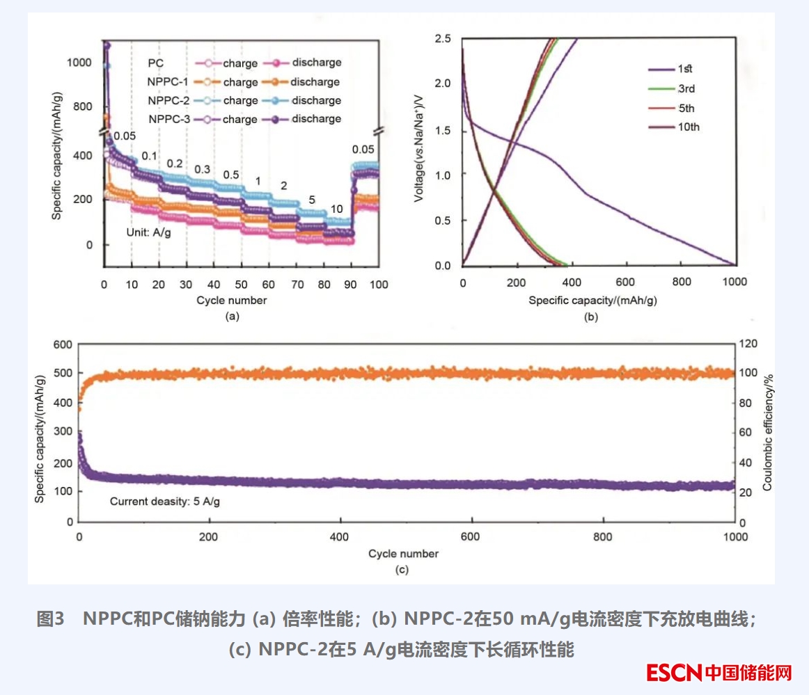 雜原子摻雜是研究較多也是較成熟的一種控制缺陷及層間距的方法??梢酝ㄟ^N、P、S、O等原子摻雜為材料提供表面缺陷及提高導電性,從而提高其倍率性能及比容量。Chen等以淀粉為原料通過熱解制備N、P共摻雜多孔碳。N、P的摻雜為捕獲鈉離子提供更多的活性位點同時一定程度上增大了樣品表面積。優(yōu)化后的樣品NPPC-2在50 mA/g電流密度下首次放電及充電容量分別為988.7和423.2 mAh/g[圖3(b)]。在100 mA/g電流下,100次充放電循環(huán)試驗可逆容量達到311.2 mAh/g,相對于未摻雜前其可逆容量有明顯的增加。0.05~10 A/g不同電流密度循環(huán)后恢復至0.05 A/g電流密度循環(huán),其可逆容量有較大回升,較循環(huán)前容量衰減較小[圖3(a)]。在5 A/g電流密度下充放電循環(huán)1000次,其可逆容量仍達到126.9 mAh/g[圖3(c)],反映出其良好的倍率性能及較大電流下循環(huán)穩(wěn)定性。原子摻雜使得石墨層間距變大及更多表面缺陷,增大鈉離子傳輸速率,提高其倍率性能。雖其擁有大的可逆容量,但首次庫侖效率(42.8%)較低,高的可逆容量犧牲了一定量的首次庫侖效率。雜原子摻雜已被證明可以有效地提高傾斜區(qū)儲鈉能力,但與首次庫侖效率發(fā)生沖突。Xie等提出了一種雜原子構(gòu)型篩選策略,通過對磷酸鹽處理的碳引入二次碳化過程,以去除不可逆的雜原子構(gòu)型,但保留可逆的雜原子構(gòu)型和自由基,實現(xiàn)高傾斜容量(250 mAh/g)和首次庫侖效率(80?%)。