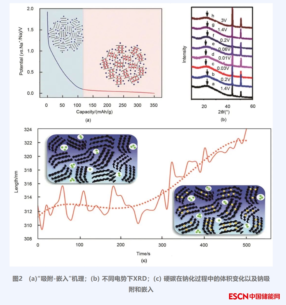 以上機理有大量文獻證明,但某些實驗現(xiàn)象是以上兩種機理所不能解釋的。同時隨著試驗方法在技術(shù)層面的發(fā)展,無論是直接還是間接證明,研究者發(fā)現(xiàn)了其他儲鈉方式,如“吸附-納米孔填充”機理、“吸附-嵌入和納米孔填充”機理等。Au等對葡萄糖進行熱解,制備一系列硬碳。結(jié)合材料分析及電化學表征證明,在斜坡區(qū),鈉儲存和連續(xù)發(fā)生在層間嵌入及缺陷孔隙表面吸附同時進行,而在平臺區(qū)鈉填充在孔隙中。Cai等通過不同溫度下碳化樹脂納米纖維制備一系列可調(diào)層間距的硬碳納米纖維。優(yōu)化后的樣品具有短程石墨層及足夠大的層間距供鈉脫嵌。利用原位X射線衍射和拉曼表征表明,斜坡區(qū)鈉在嵌入的同時伴隨著表面缺陷吸附,而平臺區(qū)為孔隙填充。Chen等分別使用葡萄糖和葡萄糖酸鎂作為碳源合成了兩種硬碳材料探究其儲鈉機理,通過原位XRD、非原位拉曼光譜和固體核磁共振技術(shù)以監(jiān)測鈉化過程中的結(jié)構(gòu)演變。實驗結(jié)果表明,硬碳的平臺區(qū)容量由層間插層和微孔填充同時貢獻,兩者的比例隨硬碳的微觀結(jié)構(gòu)而變化。理論計算結(jié)果進一步驗證了鈉離子可以以合適的層間距嵌入到類石墨片中,并以合適的直徑填充微孔?;谶@些結(jié)果,提出了一種依賴于微觀結(jié)構(gòu)的鈉存儲機制,即“吸附-嵌入/填充”混合機制。Jiang等首次在硬碳儲鈉機理中引入溶劑共插層機理,提出“吸附-共插層機理”。通過原位XRD和非原位TEM和XPS表征對此機理進行證明。同時,引入的溶劑共插層使得硬碳材料在高電流密度下,平臺區(qū)容量保持良好。Escher等通過原位電化學膨脹法(ECD)提供的有關(guān)電池循環(huán)期間電極膨脹及收縮信息發(fā)現(xiàn),在接近截止電位時,電極膨脹再次增加,而電位曲線沒有明顯變化,確認鈉儲存通過三步機制發(fā)生,即斜坡區(qū)為鈉嵌入,而在平臺區(qū)為孔隙填充和電鍍。