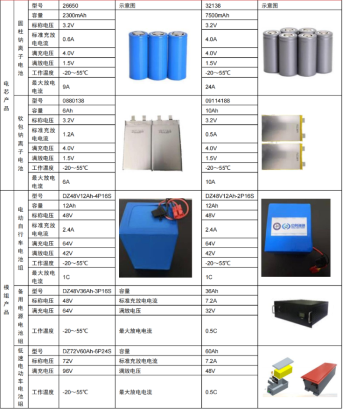 中科海鈉目前產(chǎn)品種類較為豐富,可分為電芯和模組兩類。其體積和重量不到同等容量的鉛酸電池的三分之一,能量密度已達到145Wh/kg,是鉛酸電池的3倍左右,循環(huán)壽命是鉛酸電池的十倍,同時具備5-10分鐘充電的快充能力。其中,電芯產(chǎn)品有圓柱形和軟包型兩種形態(tài),模組產(chǎn)品則根據(jù)下游應用場景的不同分為電動自行車電池組、備用電源電池組、低速電動車電池組和規(guī)模儲能電池組。