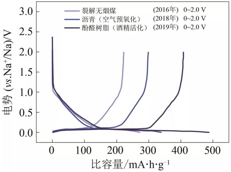 碳材料如煤炭、石墨、瀝青等已廣泛應用于生活、生產中的諸多場景。石墨是目前在鋰離子電池中應用最廣泛的負極材料,具有低成本、高比容量(可達360 mA·h/g,理論372 mA·h/g)等優(yōu)點。但是石墨在含有碳酸酯電解液的鈉離子電池中的可逆比容量卻不足50 mA·h/g,使其應用受到了很大的限制。與石墨不同,無定形碳類負極(包括硬碳和軟碳)在鈉離子電池中表現(xiàn)出較高的可逆比容量和較好的循環(huán)性能,自發(fā)現(xiàn)以來,研究人員對這類材料進行了大量的探索和研究。