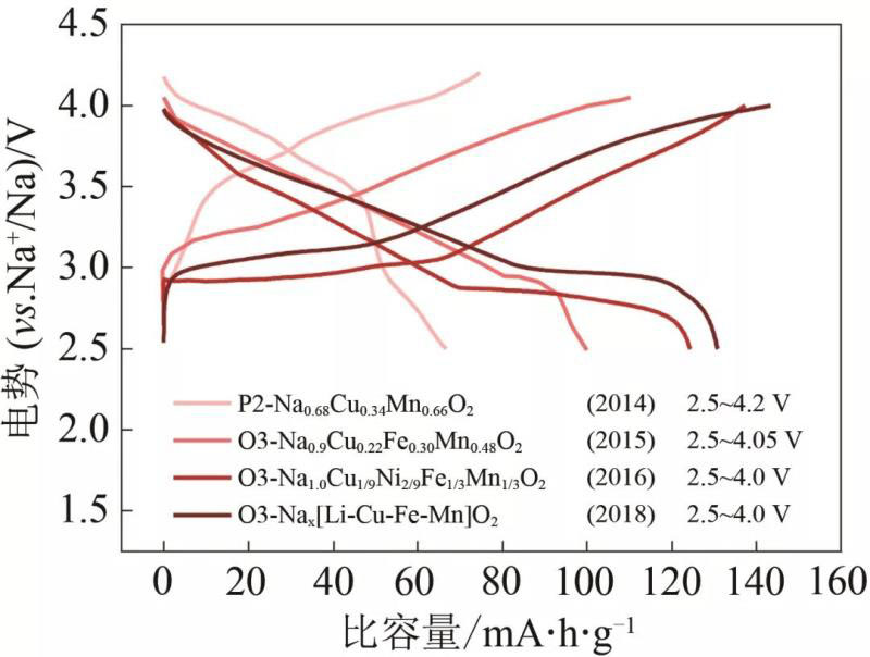 提高活性元素比例是提升層狀氧化物比容量的慣用思路,但這一思路對于Cu-Fe-Mn基正極卻不甚適用,因為直接提高Cu或Fe的含量往往會導致雜相的生成,導致性能惡化。Cu、Fe和Mn有著微妙的取代關系,需要精細的比例調控,這是在低成本正極材料探索過程中遇到的一個關鍵問題。通過進一步設計,作者團隊在2015年制備出比容量更高的、同樣對空氣/水穩(wěn)定的O3-Na0.9Cu0.22Fe0.30Mn0.48O2,該材料可逆比容量可達100 mA·h/g(2.5~4.05 V),具有較好的循環(huán)性能和倍率性能。為了進一步提升該類材料的容量,作者團隊結合了元素摻雜、提升鈉含量、調節(jié)元素比例等方法,設計了新一代Li摻雜高比容量Cu-Fe-Mn基正極材料,在2.5~4.0 V的電壓范圍內可實現(xiàn)130 mA·h/g左右的比容量。Cu、Fe和Mn元素的價格低廉、來源廣泛,且能表現(xiàn)出不遜色于Ni、 Co基氧化物正極材料的綜合性能,極具應用前景。以上材料的首周充放電曲線如圖2所示。