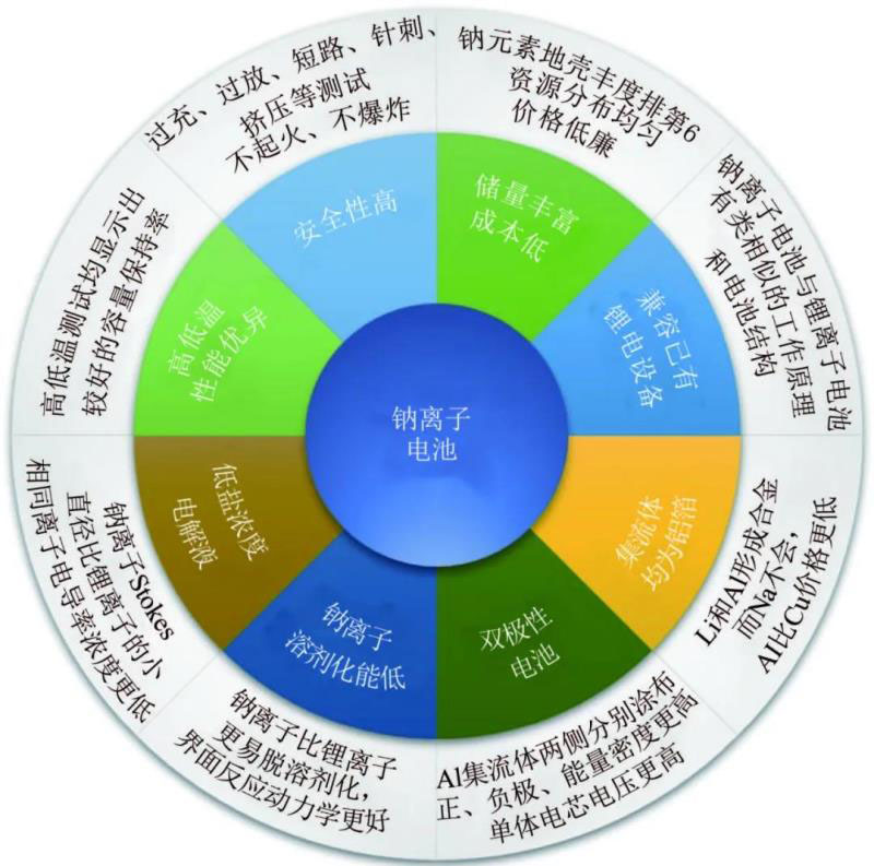 關于鈉離子電池的研究可以追溯到20世紀70年代,甚至早于鋰離子電池的研究。雖然在1991年后鋰離子電池的成功商業(yè)化吸引了大多數(shù)科學家的注意力,但鈉離子電池的發(fā)展卻從未停止,近10年來鈉離子電池的相關研究更是迎來了井噴式增長,另外關于鈉離子電池工程化的嘗試也常有媒體報道。2011年,全球首家專注鈉離子電池工程化的英國FARADION公司率先成立,之后在全世界范圍內鈉離子電池公司雨后春筍般如約而至,截至目前,全球從事鈉離子電池工程化的公司已有20家以上,其中不乏松下、豐田等巨頭公司。我國首家鈉離子電池公司中科海鈉成立于2017年,雖然晚于其他國家,但是依托于中國科學院物理研究所(下文簡稱物理所)的技術,目前在技術開發(fā)和產品生產上都已初具規(guī)模。目前根據最新的研究結果發(fā)現(xiàn)了鈉離子電池的諸多優(yōu)勢,除了鈉資源儲量豐富的優(yōu)勢之外,還具有高低溫性能優(yōu)異、安全性高、可用低鹽濃度電解液等優(yōu)點(圖1),一些技術指標甚至優(yōu)于鋰離子電池,展現(xiàn)出巨大的開發(fā)潛力。
