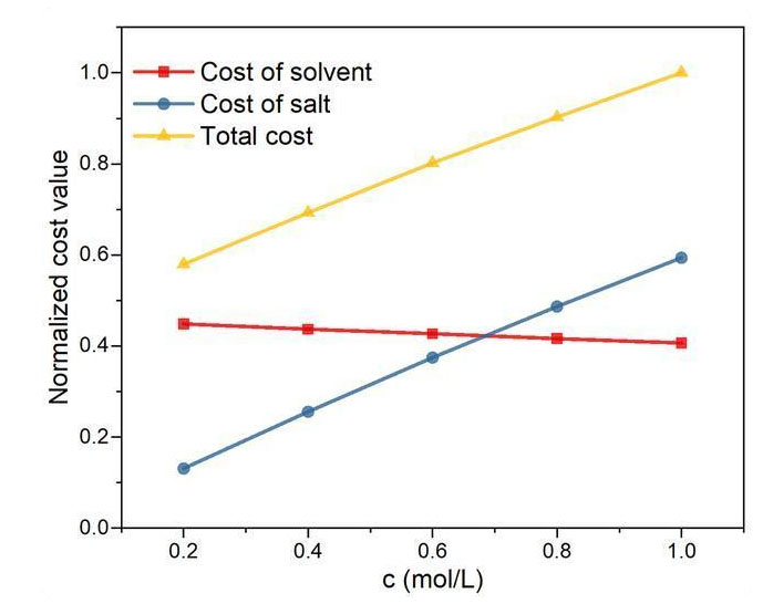 圖2:預估的不同鹽濃度下電解液成本(假設(shè)鹽是溶劑價格的11倍,按最高值歸一化)