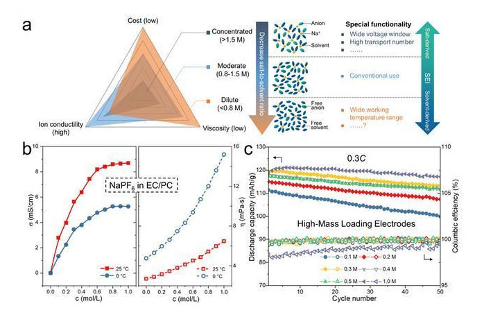 電解液是儲能電池不可或缺的重要組成部分,而調(diào)控電解液濃度是實現(xiàn)其功能化設(shè)計的有效策略之一。近年來,高鹽濃度電解液因其特殊的體相與界面特性被廣泛用于金屬鋰電池、水系電池等(本課題組曾于2013年首次提出“Solvent-in-Salt”電解液用于金屬鋰電池,Nature Communications2013, 4, 1481,引用1224次)。但與此相反,降低鹽濃度可能會帶來濃差極化,所以目前實際鋰電池應用大多集中于標準的1 M濃度,從而使得低鹽濃度電解液一直沒有得到系統(tǒng)的研究。鈉離子的Stokes半徑和脫溶劑化能均比鋰離子的要低,因此理論上采用較低的鈉鹽濃度也可實現(xiàn)足夠的動力學性能,從而使得超低鹽濃度電解液應用于鈉離子電池成為可能。考慮到鹽的成本通常是溶劑的十倍以上,減少鈉鹽使用可以有效降低鈉離子電池的成本,從而有利于鈉離子電池在儲能領(lǐng)域的大規(guī)模應用。