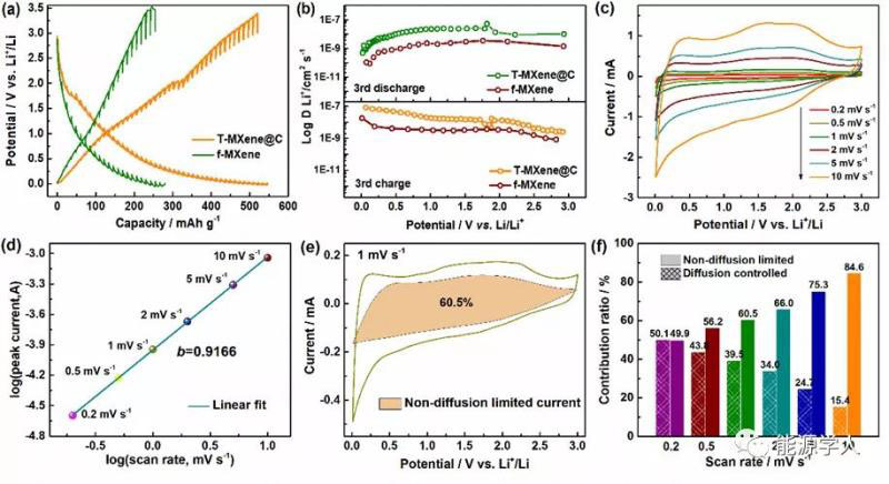 圖4 T-MXene@C的動力學(xué)儲鋰機(jī)理分析:(a)GITT曲線,(b)通過GITT曲線計算得到的鋰離子擴(kuò)散系數(shù),(c)不同掃速下的循環(huán)伏安曲線,(d)Log(i)與Log(v)的擬合曲線,(e)1 mV s-1下電容行為的貢獻(xiàn)比例圖,(f)不同掃速下的電容行為貢獻(xiàn)比例圖