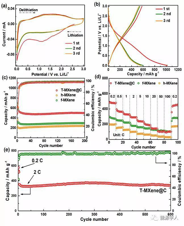 將T-MXene@C作為鋰離子電池負(fù)極進(jìn)行了電化學(xué)性能測試。T-MXene@C在0.2 C下循環(huán)200圈后比容量高達(dá)499.4 mAh g-1,高于f-MXene(294.5 mAh g-1)和h-MXene(240.1 mAh g-1)。T-MXene@C也表現(xiàn)出了較f-MXene和h-MXene顯著提高的倍率性能,其在100 C的大倍率下仍保持有102.2 mAh g-1的比容量,而電流密度恢復(fù)到0.2 C時的比容量達(dá)到453.3 mAh g-1,具有優(yōu)異的可逆性。此外,T-MXene@C電極在2C大倍率下循環(huán)600圈后的容量達(dá)到了337.9 mAh g-1,和第二圈比容量相比,容量保持率高達(dá)101.6%,說明經(jīng)炭包覆后的T-MXene@C具有優(yōu)異的結(jié)構(gòu)穩(wěn)定性。