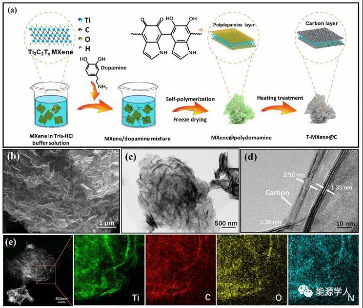 圖1(a)T-MXene@C的合成示意圖;T-MXene@C的(b)SEM圖片,(c)TEM圖片,(d)HRTEM圖片,(e)STEM圖片及相應(yīng)的元素分布圖