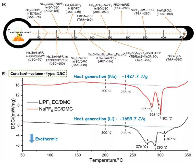 圖6(a)與熱穩(wěn)定性有關(guān)的鈉離子電池不同電解質(zhì)和電極體系的放熱起始溫度的總結(jié)。(b)NaPF6in EC/DMC與LiPF6in EC/DMC電解液的定容型DSC曲線(xiàn)對(duì)比。