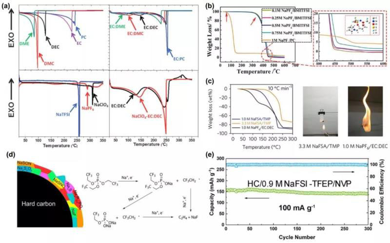 圖4(a)不同電解液的DSC熱分析曲線(xiàn)。(b)NaPF6 in PC電解質(zhì)和NaPF6 in BMITFSI電解質(zhì)的TG曲線(xiàn)。(插圖:BMITFSI的陽(yáng)離子和陰離子成分的化學(xué)結(jié)構(gòu))(c)左:NaFSI in TMP電解質(zhì)和傳統(tǒng)的1.0 M NaPF6 in EC/DEC電解質(zhì)的TG曲線(xiàn)。右:3.3 M NaFSIin TMP電解液和常規(guī)1.0 M NaPF6in EC/DEC電解液的可燃性測(cè)試。(d)TFEP電解液產(chǎn)生SEI層成分及機(jī)制的示意圖。(e)硬碳/ Na3V2(PO4)3全電池的循環(huán)性能。