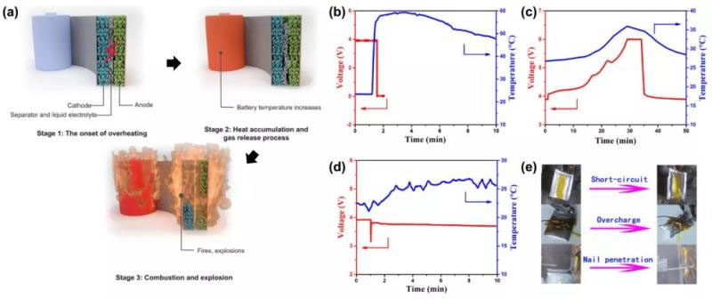 與鋰電情況類(lèi)似,NIBs安全問(wèn)題的根源在于電池內(nèi)部的熱量釋放或外部損壞引起的熱失控。如圖1a所示,熱失控過(guò)程通常包括以下三個(gè)步驟:(1)異常的過(guò)熱,過(guò)充,短路,外部沖擊等導(dǎo)致電池溫度升高到更高的值;(2)電池溫度的異常升高會(huì)觸發(fā)SEI或電解質(zhì)的分解以及電極材料晶體結(jié)構(gòu)(尤其是正極側(cè))的破壞,這會(huì)帶來(lái)更嚴(yán)重的放熱鏈反應(yīng),并釋放出可燃?xì)怏w(氧氣等);(3)上述反應(yīng)迅速傳播并擴(kuò)散到整個(gè)系統(tǒng),引起電池內(nèi)部溫度和壓力的急劇增加,即熱失控。由于有機(jī)液體電解質(zhì)的高活性,熱失控發(fā)生時(shí)導(dǎo)致最終的燃燒和爆炸幾乎是不可避免的,并將繼續(xù)損壞其他相鄰的電池。因此電池使用前進(jìn)行嚴(yán)格的安全評(píng)估是必須的。有效的安全評(píng)估包括常規(guī)安全測(cè)試(過(guò)充電/放電、外部短路、高溫老化等)和濫用條件測(cè)試(擠壓、針刺、燃燒等),并且軟包電池的分析結(jié)果比紐扣電池更可靠。以Na0.9[Cu0.22Fe0.30Mn0.48]O2/熱解無(wú)煙煤的2 Ah軟包電池為例,對(duì)該滿(mǎn)充態(tài)的軟包電池進(jìn)行安全性測(cè)試發(fā)現(xiàn)其可以通過(guò)短路、過(guò)充、針刺等嚴(yán)苛的測(cè)試條件而不起火、不爆炸,如圖1b-e所示。