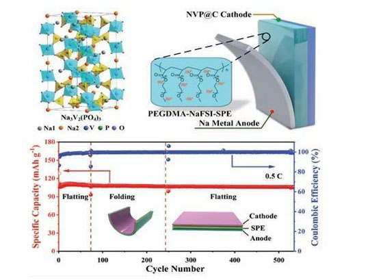 據(jù)介紹,該電池可以在0.5C倍率下穩(wěn)定循環(huán)740次,且每次的容量衰減率僅為0.007%;該電池擱置3個月后,容量保留率仍高達95%,這表明自放電率極低;軟包鈉離子電池在平鋪和彎折狀態(tài)下循環(huán)535次后,仍可提供高達355Wh/kg的能量密度(基于正極材料質量計算)。該團隊的設計策略及研究成果,為高比能柔性全固態(tài)鈉電池的發(fā)展和應用提供了新方向。