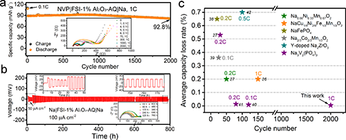 圖3.(a)NVP|FSI-Al2O3-AQ|Na的長循環(huán)性能及其循環(huán)過程中的阻抗變化;(b)Na|FSI-Al2O3-AQ|Na的循環(huán)性能及其循環(huán)過程中的阻抗變化;(c)聚合物固態(tài)鈉電池的平均容量衰減率總結(jié)