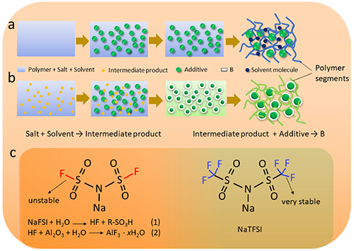 圖1.(a-b)SPE制備過程示意圖:a)傳統(tǒng)過程;b)所設(shè)計(jì)的過程;(c)NaFSI和NaTFSI的化學(xué)結(jié)構(gòu)