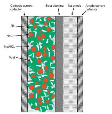 該類電池是上世紀(jì)80年代南非提出的,也叫ZEBRA電池。這種電池本質(zhì)上是一種融鹽電池,其使用熔融鹽作為電解質(zhì)實(shí)現(xiàn)內(nèi)電路的電荷傳導(dǎo),主要包括NiCl2, FeCl2, ZnCl2以及NaAlCl4等,中間使用β-Al2O3作為隔膜防止內(nèi)短路,正極為NiCl2負(fù)極為熔融態(tài)的Na金屬,運(yùn)行時(shí)的反應(yīng)為
