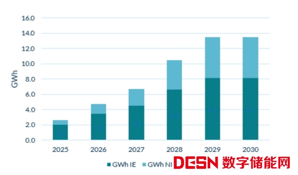 根據(jù)該公司預(yù)測的儲能市場增長曲線,愛爾蘭部署的鋰離子電池儲能系統(tǒng)容量(包括持續(xù)時(shí)間半小時(shí)至4小時(shí)在內(nèi))將從2025年的2.7GWh增長到2030年的13.5GWh。
