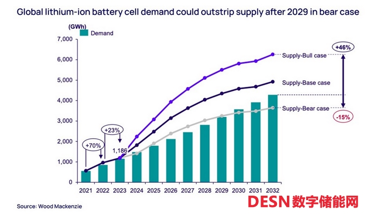 然而,從長遠(yuǎn)來看,全球電池需求將會大幅增長。Wood Mackenzie公司估計,到2032年,全球每年電池需求量將超過4TWh。其中絕大多數(shù)(84%)將來自電動汽車,只有9%來自儲能系統(tǒng)??傮w而言,全球的電池供應(yīng)能夠滿足需求,盡管在市場看跌的情況下,原材料供應(yīng)放緩可能會在2029年之后引發(fā)供應(yīng)問題(見圖1)。
