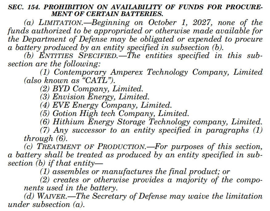 報(bào)道稱,根據(jù)美國去年年底通過的2024財(cái)年國防授權(quán)法案,美國國防部將被禁止從寧德時(shí)代、比亞迪、遠(yuǎn)景能源、億緯鋰能、國軒高科、海辰儲(chǔ)能等6家中國企業(yè)采購電池。該禁令將于2027年10月生效。不過,這項(xiàng)禁令并不適用于商業(yè)采購,比如美國福特公司正從寧德時(shí)代獲得技術(shù)許可,在密歇根州生產(chǎn)電動(dòng)汽車電池,特斯拉公司的部分電池也來自比亞迪。
