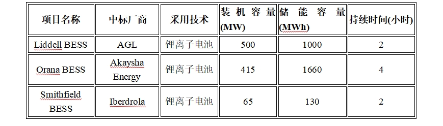 這一輪中標(biāo)的項(xiàng)目并沒有長(zhǎng)時(shí)儲(chǔ)能系統(tǒng)(LDES)。與其相反,在三個(gè)中標(biāo)的電池儲(chǔ)能項(xiàng)目中,有兩個(gè)是持續(xù)時(shí)間為2小時(shí)的電池儲(chǔ)能系統(tǒng),另一個(gè)是4小時(shí)的電池儲(chǔ)能系統(tǒng)。這三個(gè)電池儲(chǔ)能項(xiàng)目的總裝機(jī)容量為980MW,儲(chǔ)能容量2790MWh。中標(biāo)者名單如下表所示: