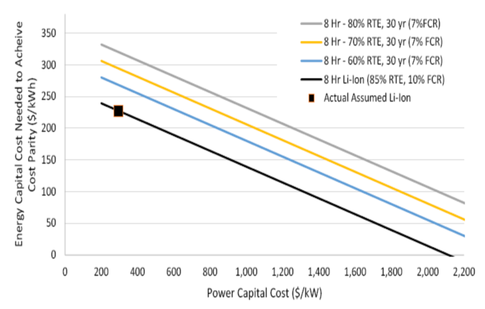 圖17提供了一個例子,顯示了實現(xiàn)8小時儲能系統(tǒng)成本持平所需的相關(guān)成本,圖中的黑線表示了與鋰離子電池具有相同工作壽命和效率的長時儲能系統(tǒng)的盈虧平衡曲線。