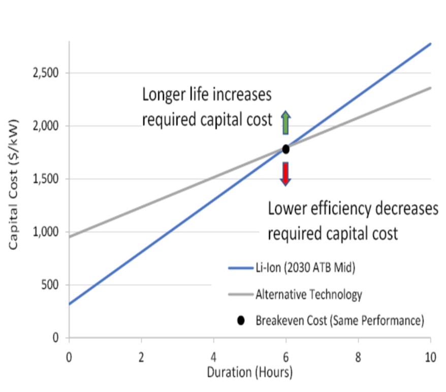 其他曲線顯示了長時儲能系統(tǒng)性能的盈虧平衡條件,包括更長的工作壽命和更低的充放電效率。如上所述,將鋰離子電池儲能系統(tǒng)作為參考,盈虧平衡意味著長時儲能系統(tǒng)的成本必須等于或低于三種不同效率水平??偟膩碚f,即使效率較低,長時儲能系統(tǒng)在其生命周期中的成本仍可能與鋰離子電池儲能系統(tǒng)持平。