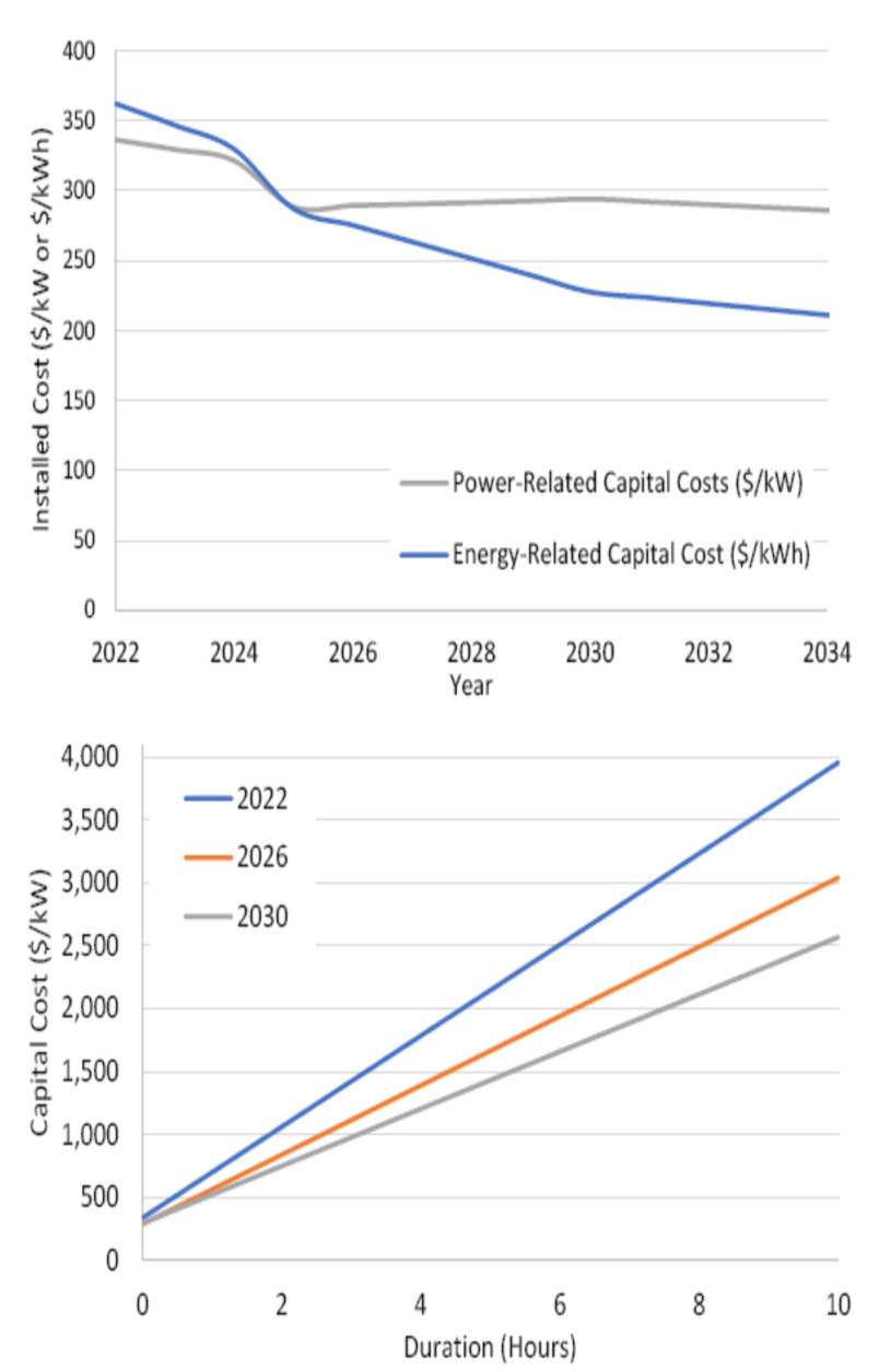 圖15(上圖)顯示了對鋰離子電池儲能系統(tǒng)2023年投資成本的估計。儲能系統(tǒng)的總投資成本(以美元/kW為單位,這是衡量發(fā)電成本的標準)如圖15(下圖)所示。曲線的斜率表示與儲能容量相關(guān)的成本,隨著時間的推移,預期成本的降低會降低成本曲線的斜率。應(yīng)該指出的是,由于面臨供應(yīng)鏈問題,造成了電池儲能系統(tǒng)成本的大幅波動。