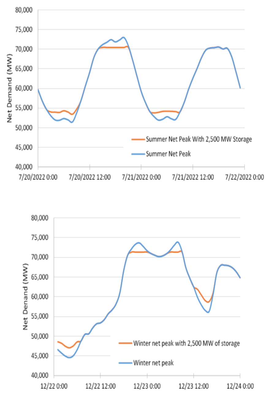 圖11表明,冬季電力需求峰值期間往往比夏季電力需求峰值期間更長。它使用2022年ERCOT公司數(shù)據(jù)模擬了儲能系統(tǒng)對凈負(fù)載曲線的影響。圖11的上圖(7月20日至21日)顯示了儲能系統(tǒng)對夏季電力峰值期間凈負(fù)荷的影響,雖然峰值期間已經(jīng)擴(kuò)大,但仍然大約有4到5個小時,這意味著4小時儲能系統(tǒng)將保持接近滿負(fù)荷的電量。然而,圖11的下圖(12月22日至23日)顯示冬季電力需求峰值期間擴(kuò)大到8小時,因為夜間的電力需求仍然很高,儲能系統(tǒng)幾乎沒有機(jī)會充電。