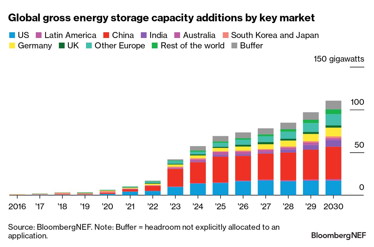 到2030年底的全球累計(jì)儲(chǔ)能裝機(jī)容量預(yù)測(cè)
