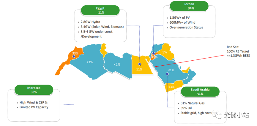 目前MENA可再生能源發(fā)電市場(chǎng)已初具規(guī)模,截至2022年底,約旦在運(yùn)營(yíng)的的光伏和風(fēng)力發(fā)電約為2.4GW(占比34%),摩洛哥光伏風(fēng)電發(fā)電占比為33%,埃及可再生能源發(fā)電裝機(jī)+在建項(xiàng)目為10GW,沙特紅海地區(qū)的可再生能源規(guī)劃中儲(chǔ)能裝機(jī)計(jì)劃達(dá)到了1.3GWh。