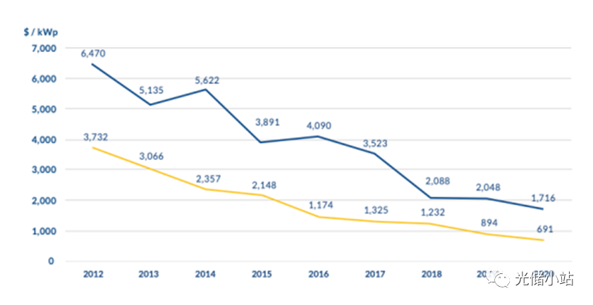 以黎巴嫩為例,其光伏配儲(chǔ)率隨著其光儲(chǔ)系統(tǒng)價(jià)格的下降而不斷上升,2020年黎巴嫩的光伏配儲(chǔ)率達(dá)到了12%,共有11,087kWp光伏配備了儲(chǔ)能系統(tǒng)。