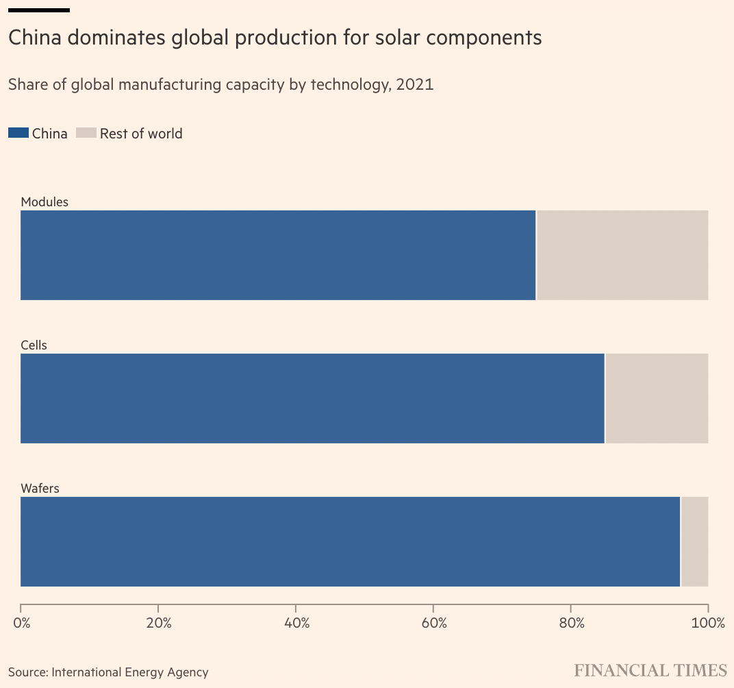 通過推動美國制造產(chǎn)品,美國正試圖對抗中國在全球清潔技術(shù)供應(yīng)鏈中的主導(dǎo)地位。根據(jù)國際能源署的數(shù)據(jù),中國生產(chǎn)了世界上幾乎所有的硅片、85%的電池和四分之三的組件。中國也是世界上多晶硅的關(guān)鍵生產(chǎn)國,多晶硅是太陽能組件的關(guān)鍵原材料。