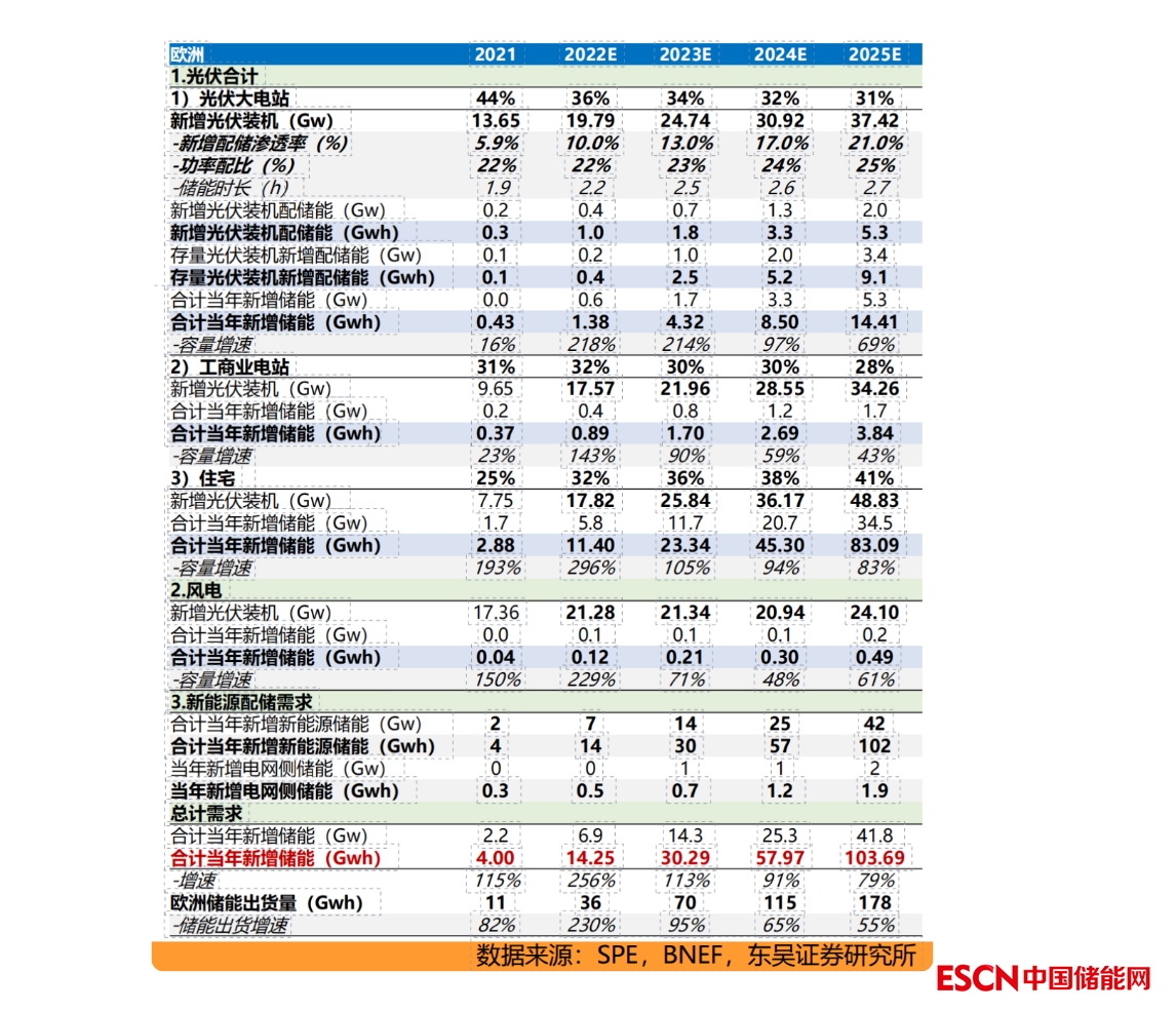 據(jù)東吳證券測(cè)算2023/2025年歐洲儲(chǔ)能新增容量需求為30GWh/104GWh,2023年同增113%,2022-2025年CAGR=93.8%。