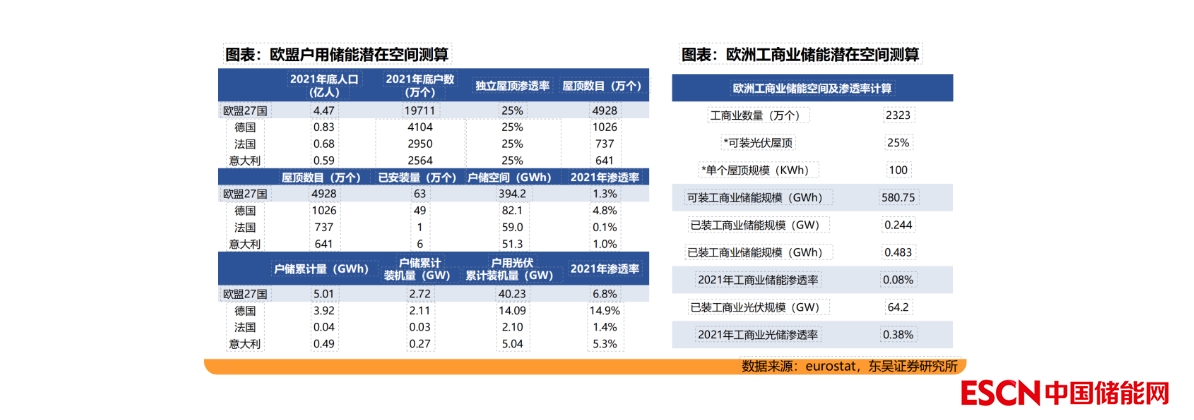 歐洲可開(kāi)發(fā)光儲(chǔ)屋頂空間廣闊,戶用達(dá)394GWh,工商業(yè)達(dá)581GWh!戶用:根據(jù)歐盟統(tǒng)計(jì)局?jǐn)?shù)據(jù),2021年歐盟/德國(guó)有1.97/0.41億戶,假設(shè)25%的獨(dú)立屋頂(且適宜安裝),則歐盟/德國(guó)有4928/1026萬(wàn)個(gè)可安裝光儲(chǔ)的屋頂,假設(shè)每戶平均10kwh,2021年歐盟/德國(guó)戶儲(chǔ)滲透率僅1.3%、4.8%,歐盟/德國(guó)戶儲(chǔ)仍分別有394.2/82.1GWh的可開(kāi)發(fā)空間。工商業(yè):2021年歐洲共有2323萬(wàn)工商業(yè)戶數(shù),假設(shè)25%的可裝光伏屋頂,每戶平均100kwh,歐盟工商業(yè)儲(chǔ)能有580.75GWh的可開(kāi)發(fā)空間,截至2021年歐盟滲透率僅0.08%。