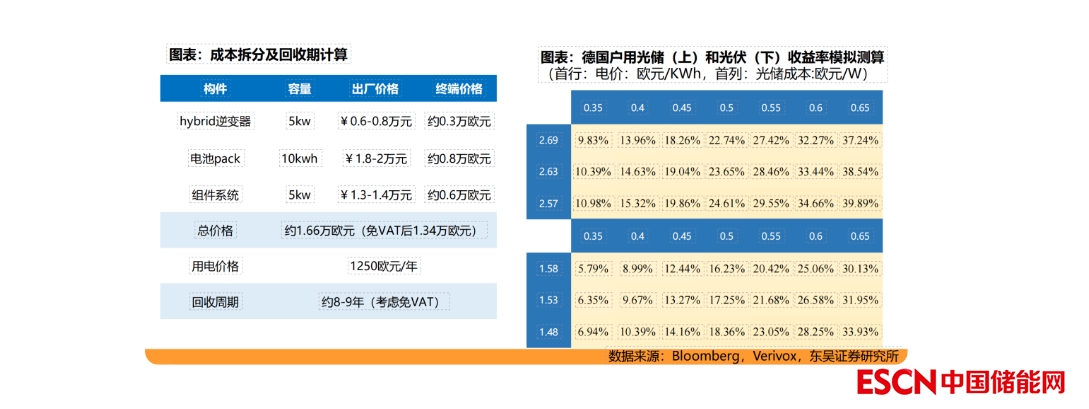 案例:假設(shè)系統(tǒng)由5kW逆變器及10kWh儲(chǔ)能電池構(gòu)成,系統(tǒng)售價(jià)為逆變器、電池、組件及安裝費(fèi)用三者之和共1.66萬(wàn)歐元,考慮到免除VAT后安裝價(jià)格為1.34萬(wàn)歐元。據(jù)東吳證券測(cè)算得出,45歐分電價(jià)假設(shè)下德國(guó)戶用光儲(chǔ)系統(tǒng)即有18.3%收益率(考慮19%VAT退稅),回收周期為7-8年;若僅安裝光伏,IRR降至12.4%,回收期需13-14年??傮w來(lái)看,德國(guó)戶用光儲(chǔ)經(jīng)濟(jì)性十分強(qiáng)勁,我們預(yù)計(jì)未來(lái)隨著光儲(chǔ)系統(tǒng)成本的下降,戶儲(chǔ)需求將持續(xù)提升!